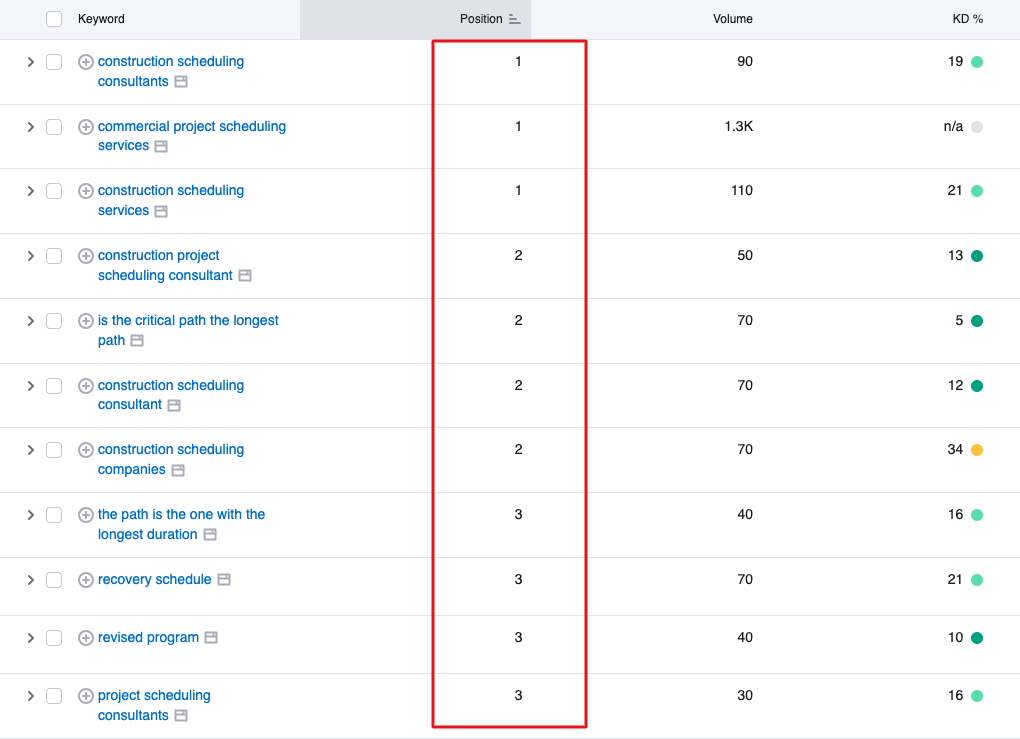 • High-value keywords moved to #1 position (e.g., “Construction scheduling services,” construction scheduling consultants”)